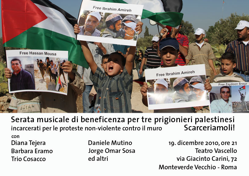 Si da notizia che il 19 dicembre alle ore 21, presso il Teatro Il Vascello interverranno i musicisti Diana Tejera, Barbara Eramo, il Trio Cosacco, Daniele Mutino, Jorge Omar Sosa ed altri musicisti per una serata di beneficenza per la raccolta di fondi utili alla liberazione dei tre leader del Comitato Popolare Contro Il Muro Di Ni'lin.